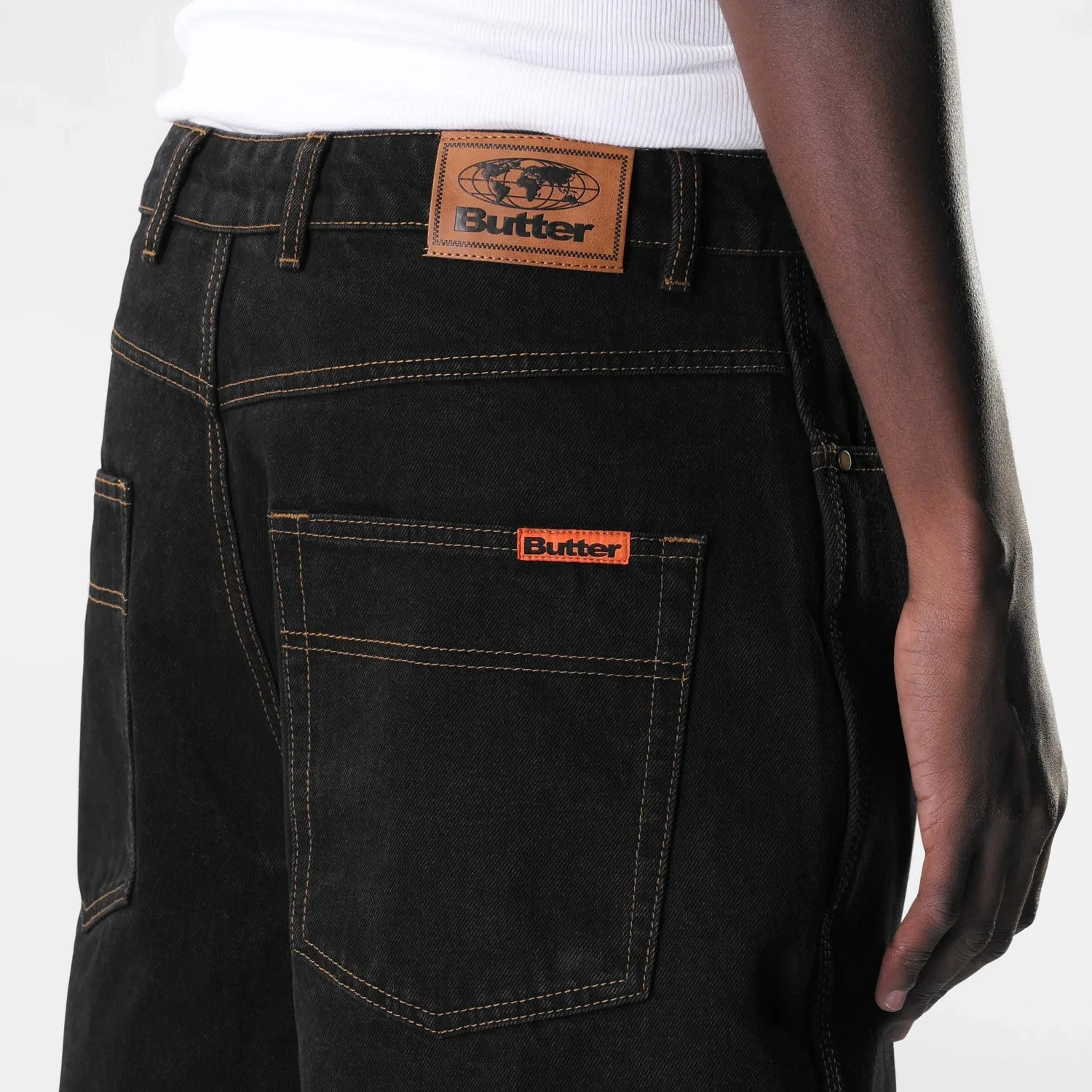 - gewebtes Etikett auf Münztasche und Gesäßtasche